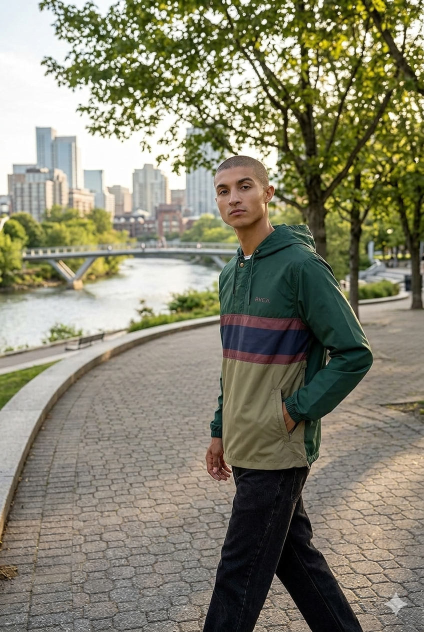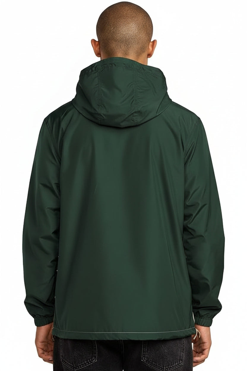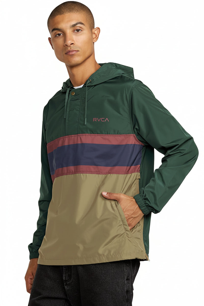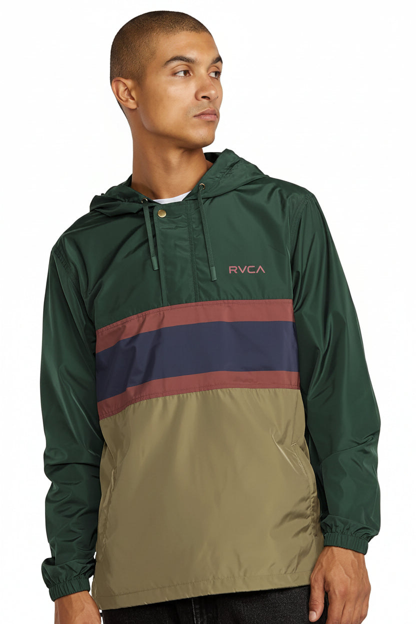 Campera anorak de poliéster 100% con tejido tafeta resistente y recubrimiento de 600 mm. Diseño regular con capucha extendida y mangas largas para máxima protección. Cierre central con tapeta y 2 bolsillos de ojal con cierre oculto. Broches de metal RVCA y abertura de puños con ribete en lycra para ajuste cómodo. Detalle de cordón elástico interno en el dobladillo con cierre de palanca y cierre lateral izquierdo. Estampado de alta densidad en el pecho. Ideal para días ventosos y lluviosos.