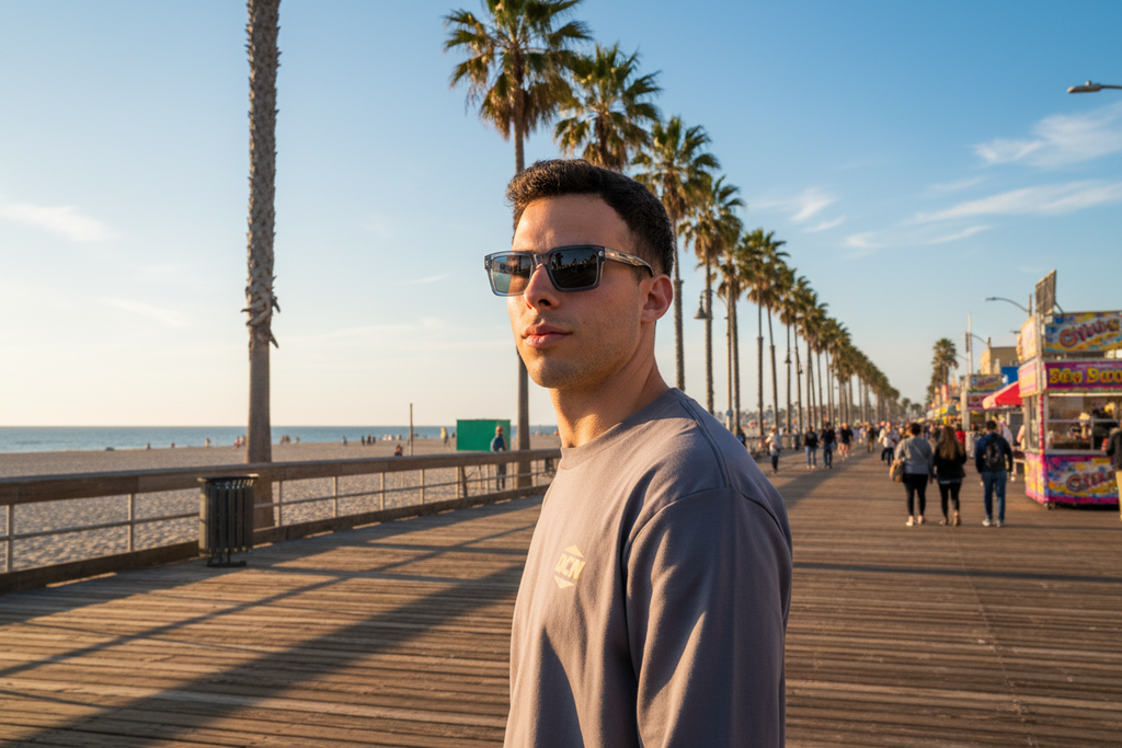 Anteojos de sol unisex OCN en negro con marco gris, fabricados en acetato biodegradable. Incluyen estuche y tela limpiadora. Perfectos para la playa o uso diario, combinan estilo con responsabilidad ambiental.