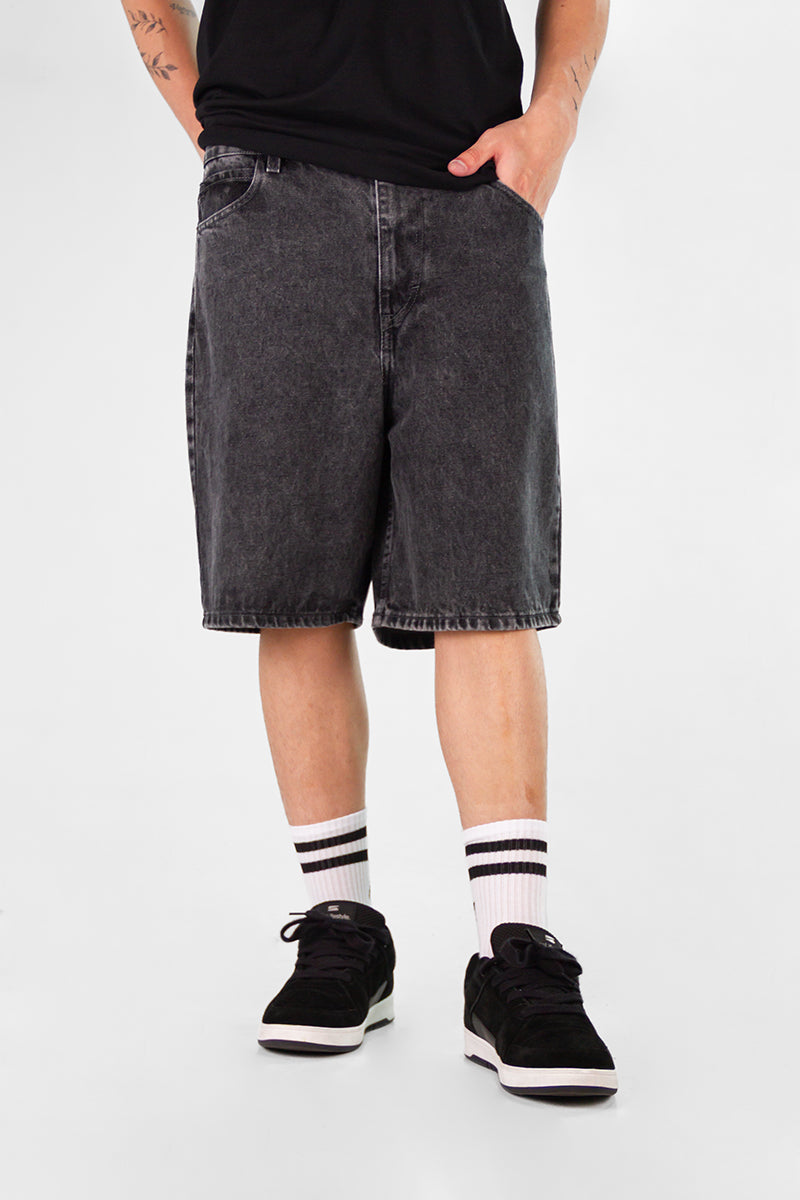 Bermuda Kingpin con ese toque vintage que te encanta: gris desgastado que cuenta historias. Bolsillos funcionales adelante y atrás para guardar lo que necesites. Detalle de lujo: etiqueta con logo de marca en símil cuero que le da ese toque de autenticidad. Comodidad y estilo en una sola prenda.