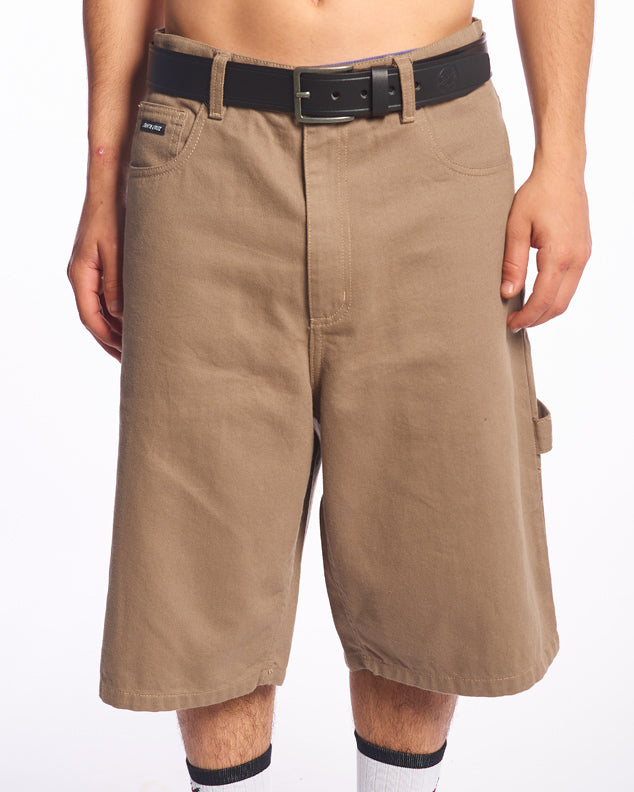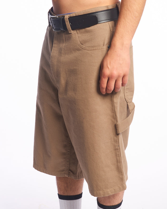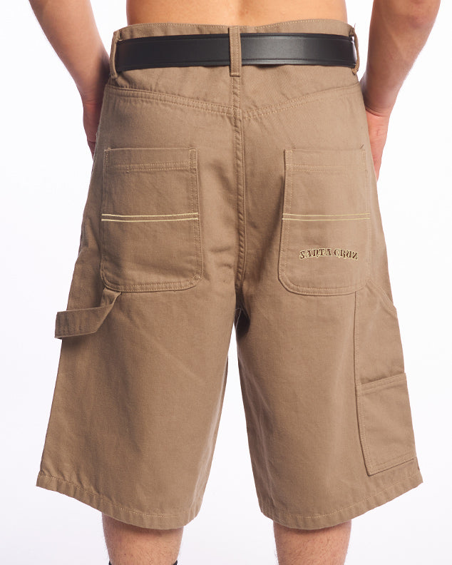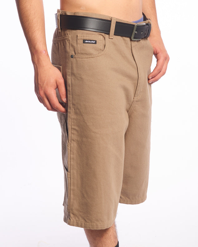 Bermuda Santa Cruz Dead Diners Arch. LOOSE FIT 23”. Etiqueta de marca/talle. Stone wash. 5 Bolsillos. Carpintero. Costuras, atraques y ojal a contratono. Presillas de 1,5 cm. Botón metálico marcario. Grifa de marca. Bordado y alegoria en bolsillos de espalda. DENIM BROWN 11,5oz. 100% algodón.