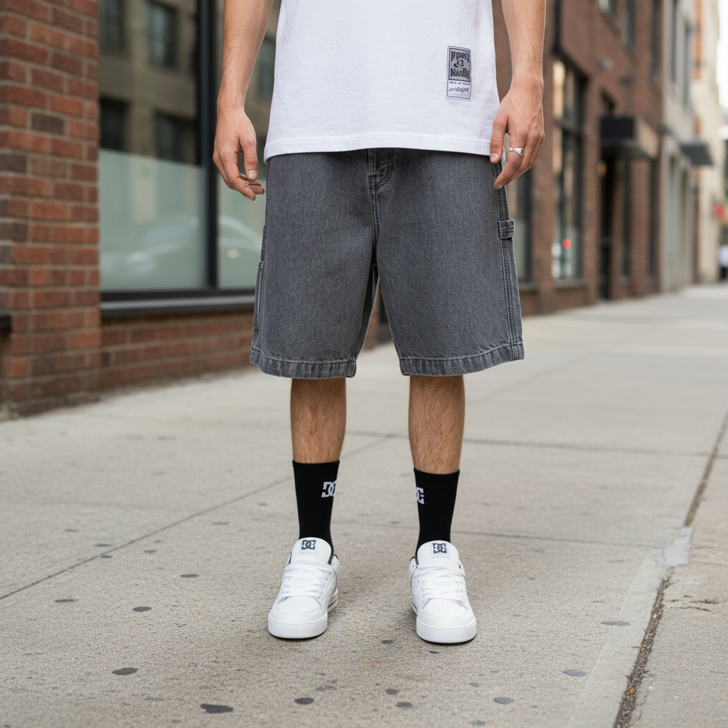 Bermuda DC Baggy con cierre con botón, cremallera metálica en bragueta. Cuenta con dos bolsillos delanteros en diagonal. Dos bolsillos de parche en la parte trasera. Corte holgado en la cadera y el muslo. [Tejido principal] 80% algodón, 20% algodón reciclado.