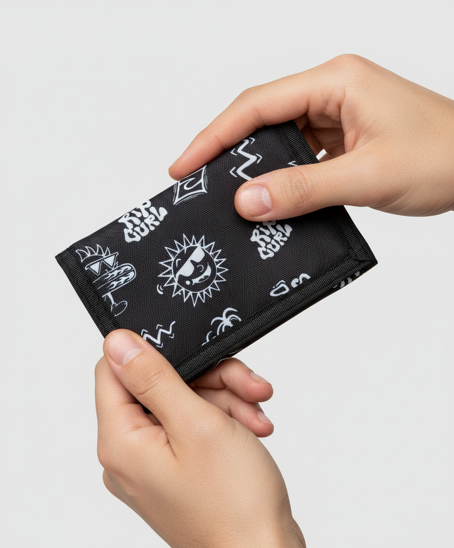 La Savages Surf Chain es una billetera de estilo punk con cierre de velcro, ventana de ID, múltiples ranuras de tarjetas, compartimentos de billetero sencillo y monedero con cremallera, y cadena. Incorpora un llamativo logotipo de Rip Curl en la parte delantera.