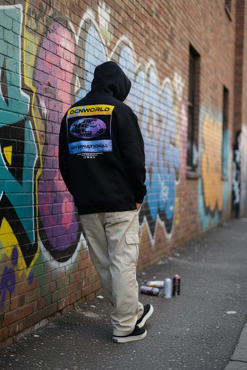 Buzo canguro color negro con friza interior súper abrigada. Cuenta con bolsillo frontal tipo canguro y estampa delantera. Ideal para el frío y con toda la onda urbana de OCN. 🔥