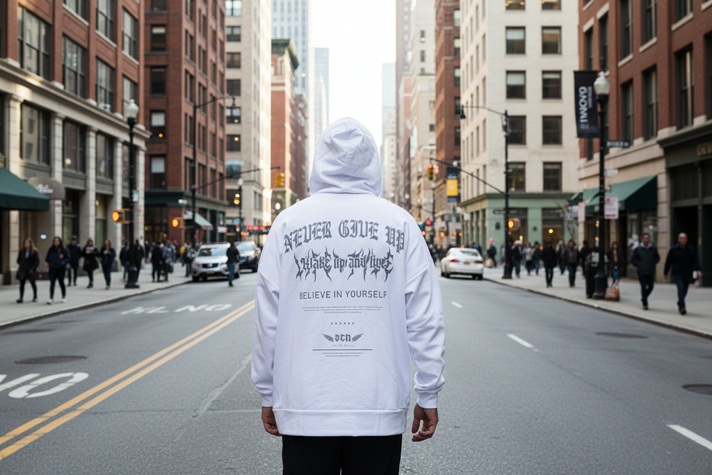 Buzo OCN Gothic Blanco con capucha y bolsillos canguro, sin frisa, con estampado en pecho y en espalda completa, ideal para el verano!