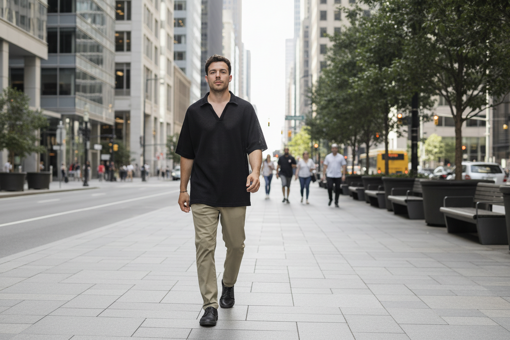 Esta chomba Negro Oversize de tela Nido de Abeja es la combinación perfecta de simplicidad y estilo. Su color Camel intenso le da una apariencia sofisticada, sutil y elegante. Confeccionada en tela Nido de Abeja suave y cómodo, es ideal para aquellos que buscan una opción versátil y de buena calidad, apta para cualquier ocasión casual o semi-formal. Perfecta para quienes aprecian un diseño limpio pero con personalidad.