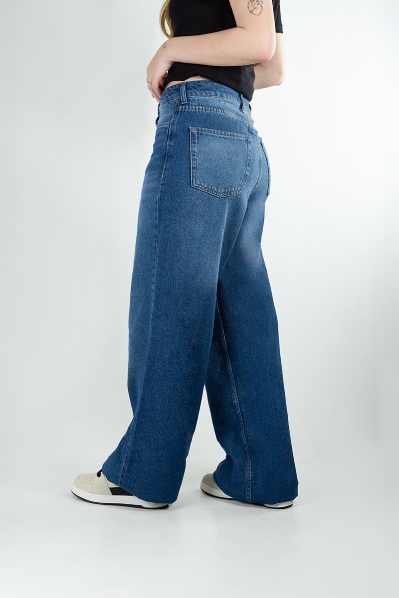 Jean Ocn Mom denim rígido color azul, estilo Mom. Cuenta con bolsillos delanteros y traseros.