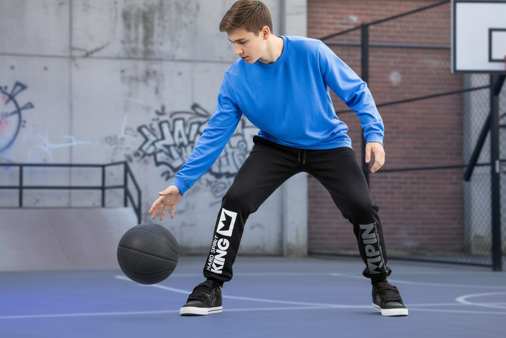 Jogging Kingpin. Material algodón con frisa, prenda de color negro con estampa al frente a contra tono. Este modelo tiene elástico y cordón en cintura y puños. Cuenta con 2 bolsillos en los laterales. Parche de la marca en bolsillo izquierdo.