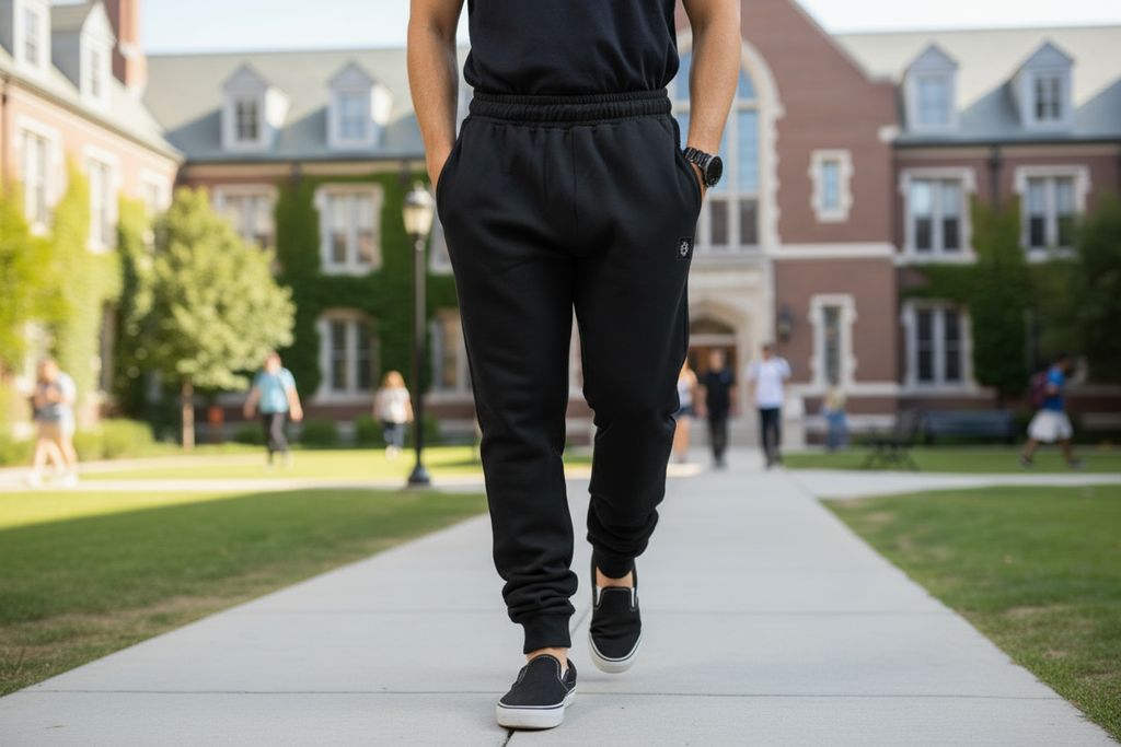 Jogger cómodo en negro con bolsillos funcionales y cordón ajustable. Confeccionado en algodón puro sin frisa, ideal para tu día a día. Incluye pequeña estampa de marca.