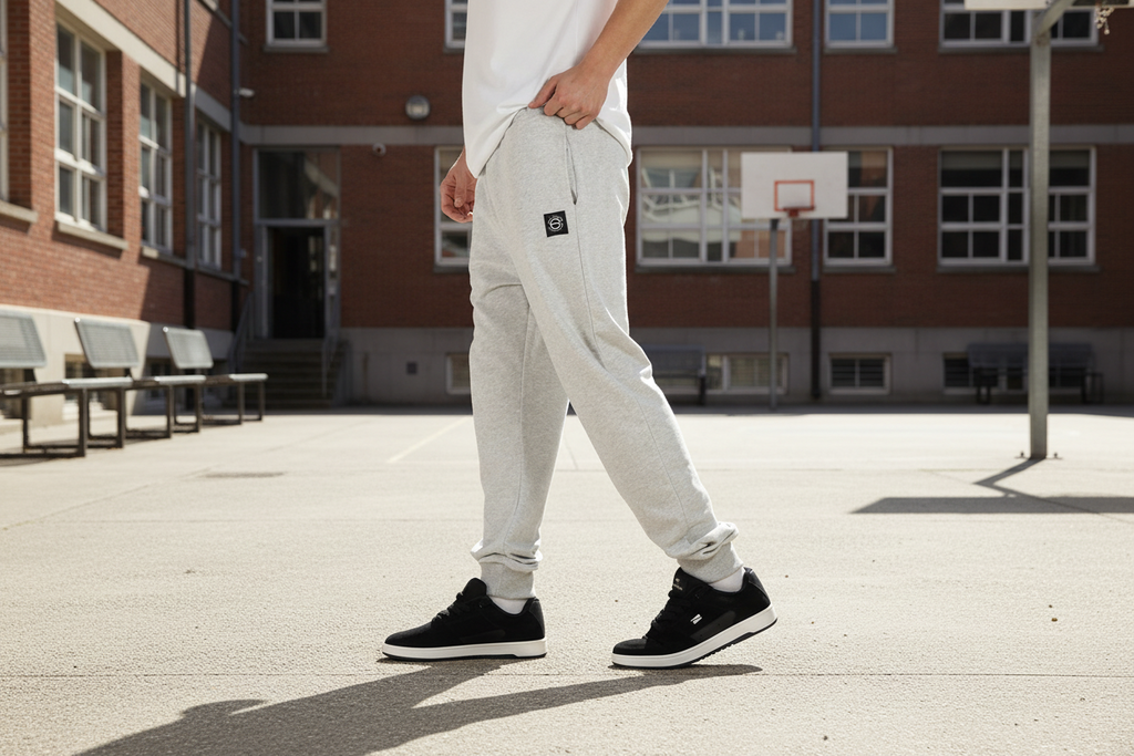 Jogging Ocn en algodón suave gris con detalles de marca. Cordón ajustable y bolsillos funcionales para máxima comodidad.