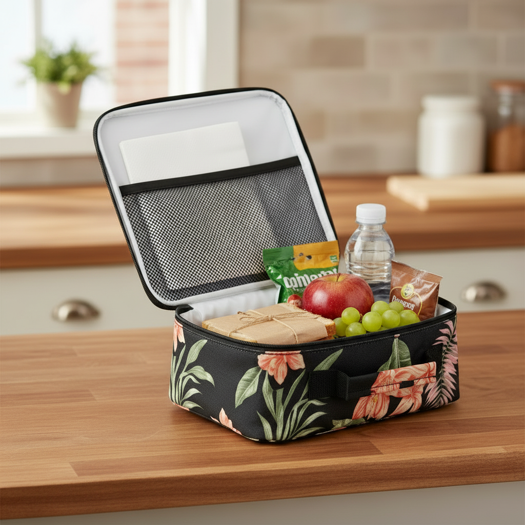 Lunchera Roxy Life en negro fabricada con poliéster reciclado estampado, ideal para transportar tus alimentos con estilo. Dispone de un espacioso compartimento principal con cierre de cremallera, bolsillo frontal adicional y asa lateral ergonómica. Con dimensiones de 21 x 26 x 10 cm y distintivo parche Roxy en algodón. Una opción ecológica y práctica para el día a día.