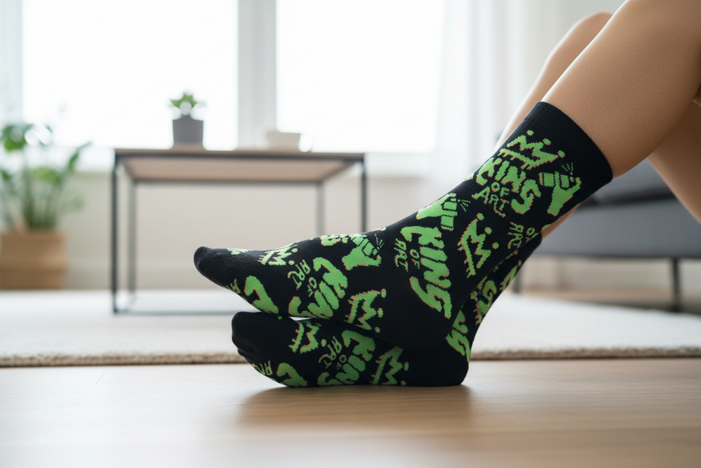 Medias KING OF ART en negro con detalles verdes que le dan ese toque urbano que buscas. Cómodas, con ajuste que no se corre y largo clásico para cobertura total. Perfectas para cualquier outfit casual o deportivo. Sentí la diferencia en cada paso.