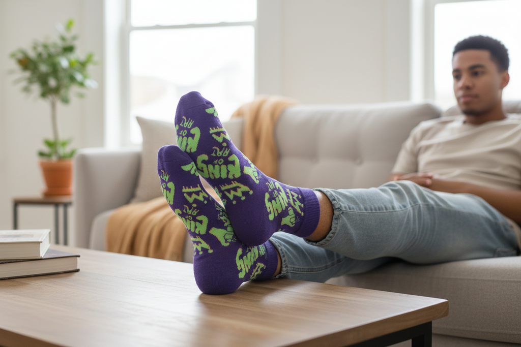 Medias King Of Art en violeta con detalles en verde que destacan el logo de la marca. Diseño hasta la rodilla, cómodos y versátiles para cualquier look. Perfectas para expresar tu estilo sin límites. Paquete x1 par.