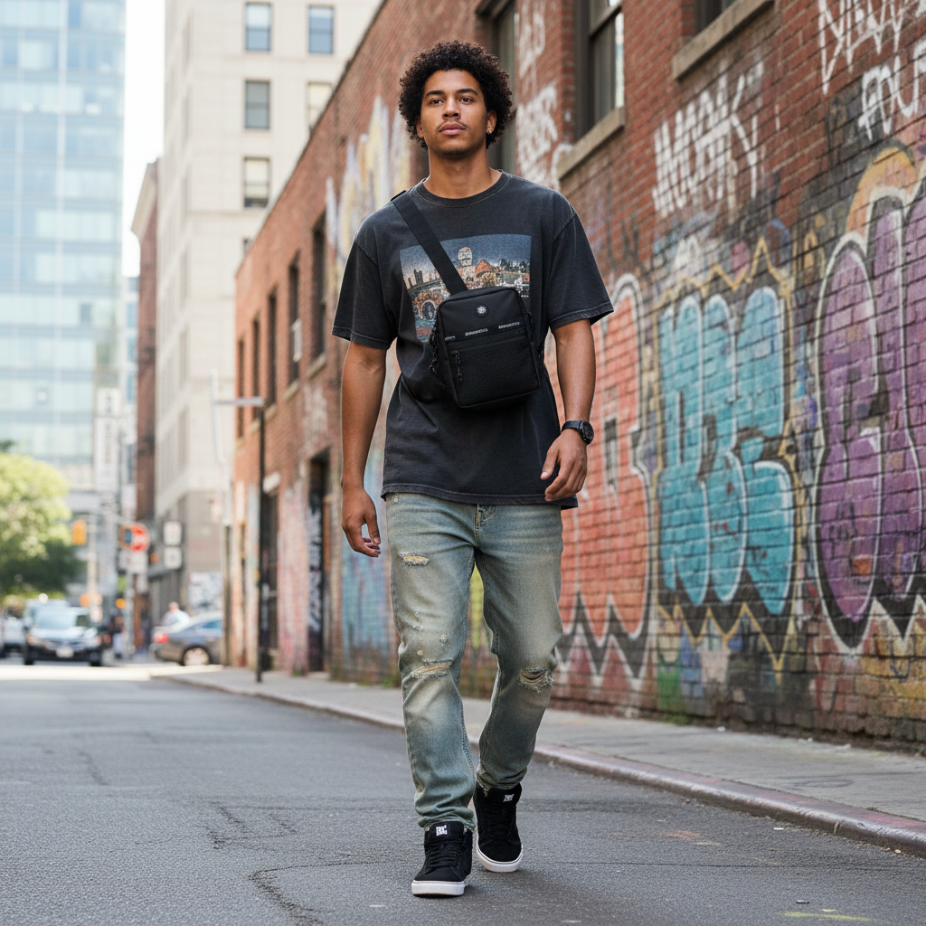 Morral bandolera Starcher 5 de DC en poliéster reciclado. Diseño compacto de 2 litros con compartimento principal y bolsillos de cremallera para organizar tus pertenencias. Correa ajustable para máxima comodidad. Perfecto para el día a día, viajes cortos o actividades urbanas. Producto importado de calidad.