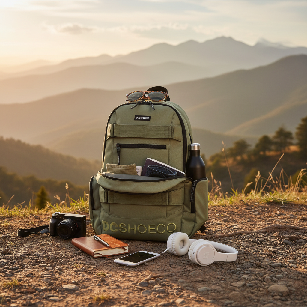 Mochila DC Breed en verde con tela Cordura 100% poliéster reciclado. Diseño funcional con 1 compartimento principal, bolsillos laterales con cremallera y organizador interno. Correas acolchadas ajustables y panel posterior con malla aérea para máxima comodidad. Capacidad de 25 litros, perfecta para el día a día. Medidas: 49 x 31 x 17 cm.