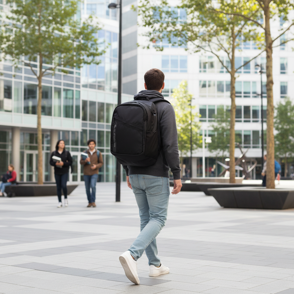 TELA: 100% Poliéster reciclado Mochila 1 compartimento principal con cierre. Compartimiento para laptop con cierre 2 bolsillos laterales y 1 frontal con cierre. Correas ergonómicas para hombro Panel trasero acolchado Organizador interior, bolsillo para lentes de sol Dimensiones: 44 x32 x 23 cm. Volumen: 30L Producto Importado