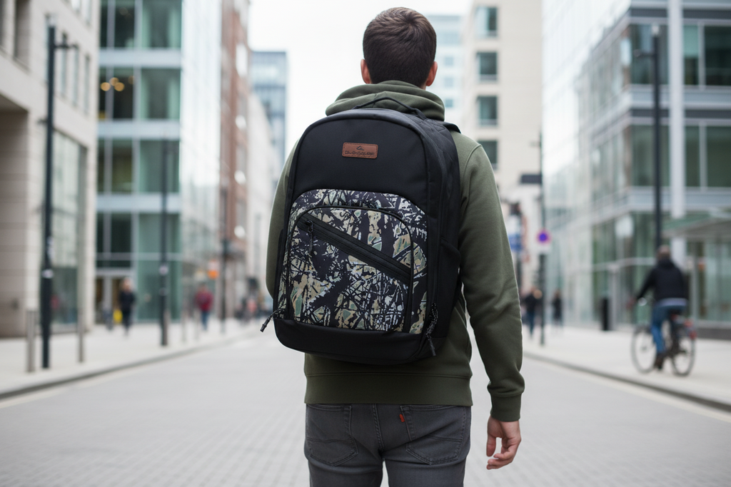 TELA: 100% Poliéster reciclado Mochila 1 gran compartimiento principal con cierre y bolsillo para laptop 1 bolsillo frontal refrigerador con Bolsillo superior con cierre, 2 bolsillos laterales con malla Correas ergonómicas para hombro Dimensiones: 46 x 32 x 22 cm Volumen: 30L Producto Importado