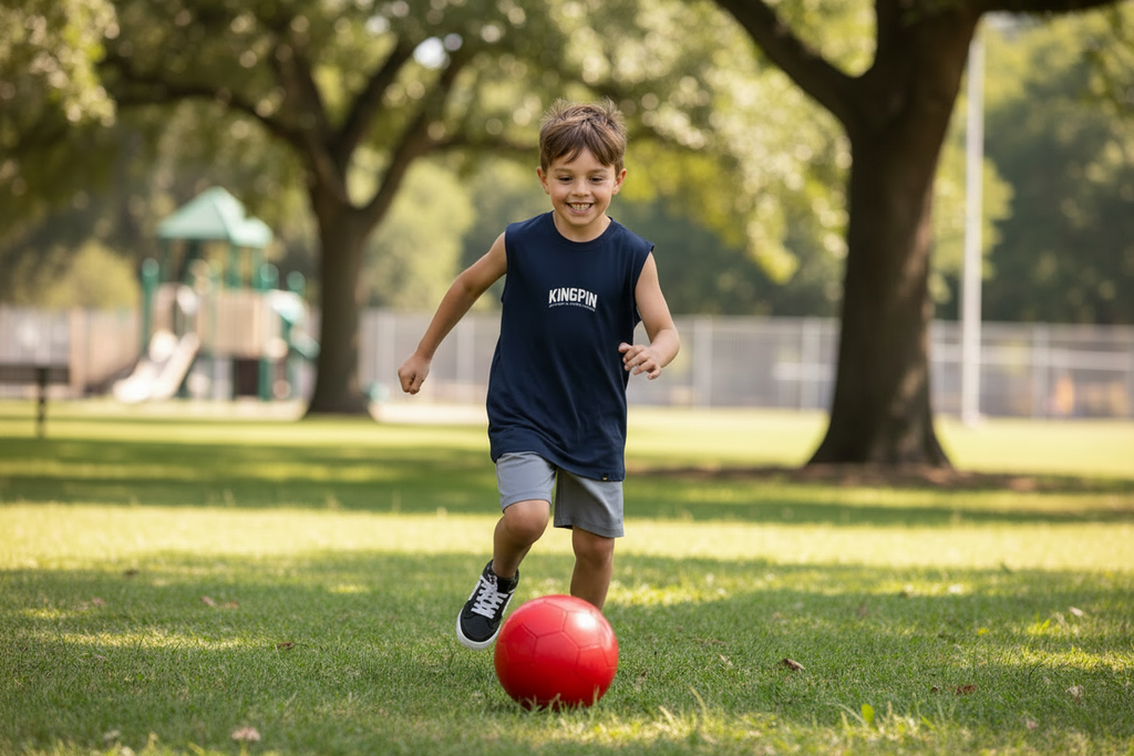 Musculosa infantil Kingpin Kids Ollie en Azul, diseñada para el confort y la libertad de movimiento de los más pequeños. Confeccionada con tela de calidad que respira y se adapta al cuerpo en desarrollo, esta prenda es perfecta para el día a día, desde el juego activo hasta las salidas casuales.