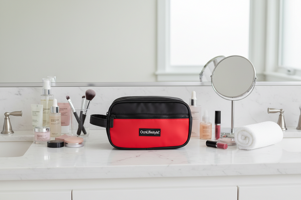 Neceser Ocn Box Rojo con logo de OcnLifestyle. Cuenta con compartimento principal y bolsillo frontal con cierres de cremallera, más manija lateral reforzada. Perfecto para organizar artículos de higiene, accesorios deportivos o como cartuchera multiuso. Práctico y versátil para llevar a cualquier lado.