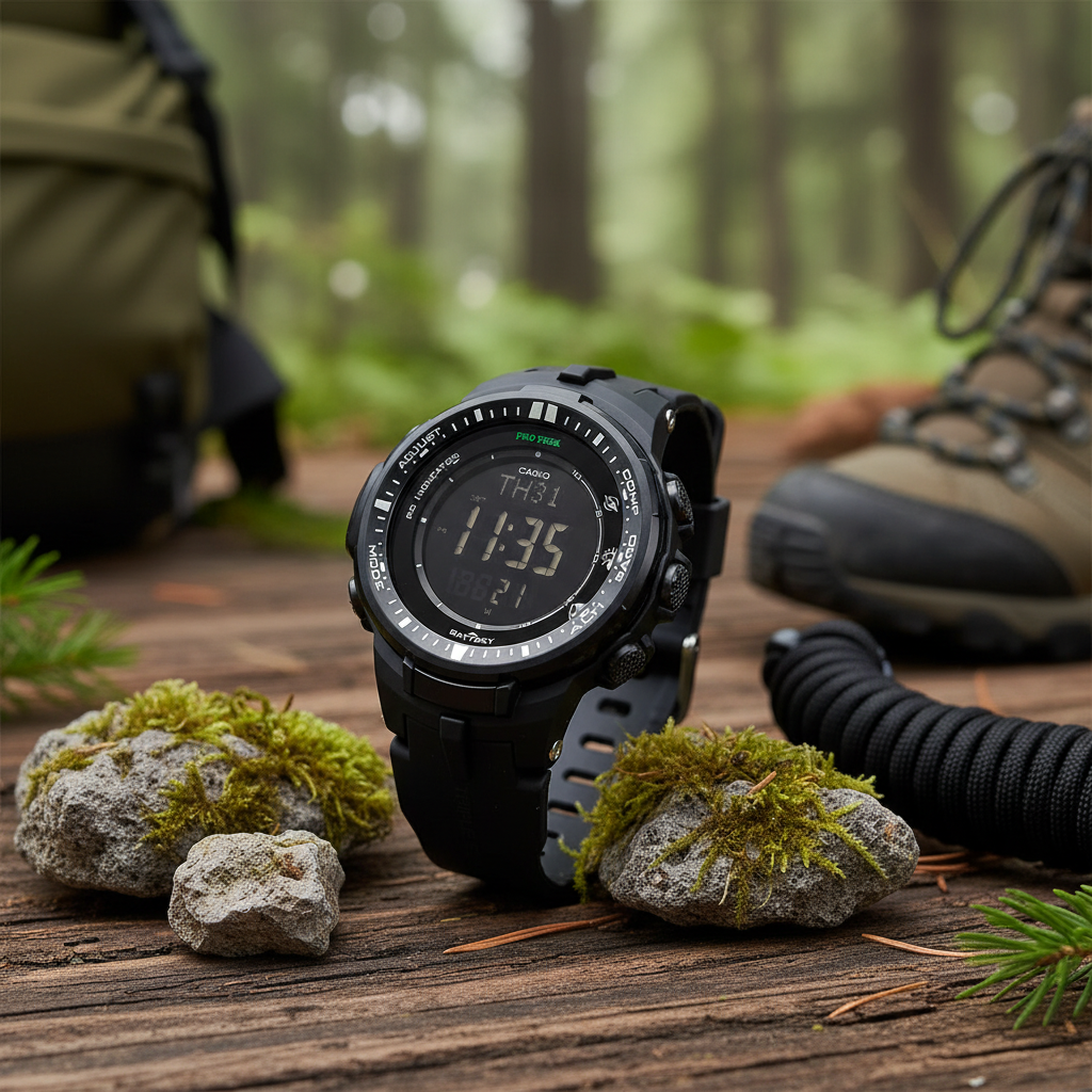 Reloj Casio PRW3000-1A: tecnología solar de alto rendimiento para exploradores. Resistente al agua (100m) y temperaturas extremas, incluye brújula digital, altímetro, barómetro y termómetro. Recepción automática de señal horaria, pantalla LED brillante y batería solar infinita. Compacto, preciso y diseñado para aventuras sin compromisos.