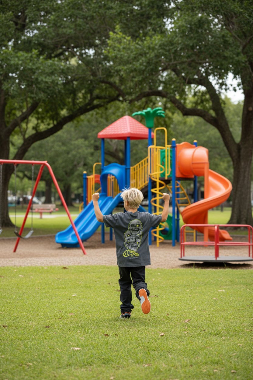 Remera de algodón y punto jersey de algodón reciclado con 200 g/m² de peso. Corte estándar con cuello redondo que ofrece comodidad y versatilidad para el día a día. Diseño frontal y dorsal con estampados abultados de plastisol centrados, que le dan un acabado visual destacado. Etiqueta serigrafiada en el centro de la nuca y etiqueta sujeta en el dobladillo para mayor durabilidad. Composición: 75% algodón y 25% algodón reciclado, combinando calidad con responsabilidad ambiental. Prenda resistente y cómoda, ideal para niños que buscan estilo y practicidad.