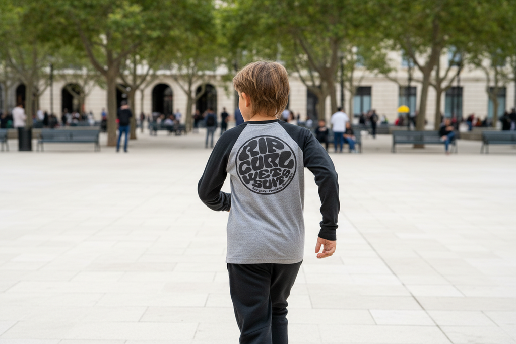 Remera ranglan manga larga Rip Curl KIDS. Combinada negro y gris. Con estampa frontal y en espalda. Material: 50% Algodón 50% Poliéster. Origen: Argentina.
