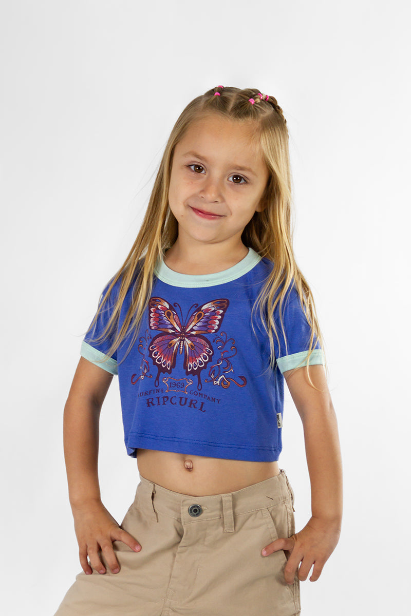 Remera Rip Curl Butterfly Ribb. RIBB. Baby tee fit. Etiqueta Marca/Talle interna. Tirillera de hombro a hombro. Envivado a contratono en sisas y escote. Estampa en delantero. Grifa de marca. Muchos colores surtidos. 100% algodon.