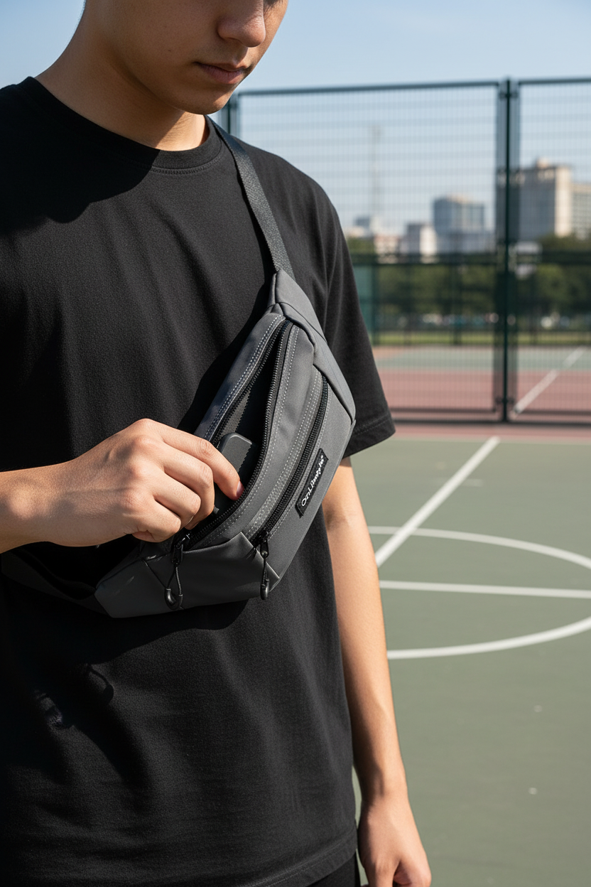 Riñonera Ocn Milo en gris con tela Cordura resistente. Cuenta con dos cierres frontales, uno trasero y correa ajustable para adaptarse a tu comodidad. Perfecta para llevar tus pertenencias de forma segura y práctica en cualquier actividad.