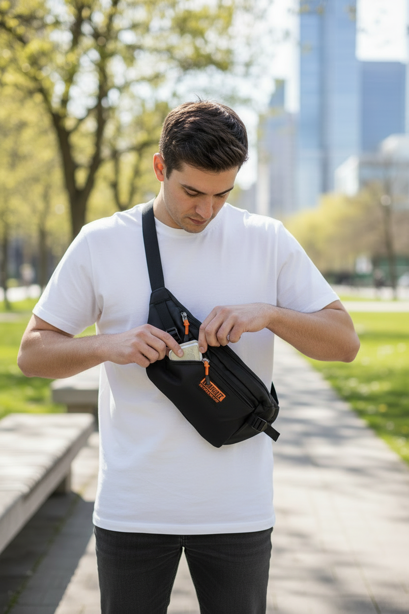Riñonera Ocn Nuba en negro con tela Cordura resistente. Tres cierres frontales y cierre trasero para organizar tus pertenencias. Correa ajustable que se adapta a tu comodidad. El accesorio perfecto para llevar lo que necesitas siempre a mano.