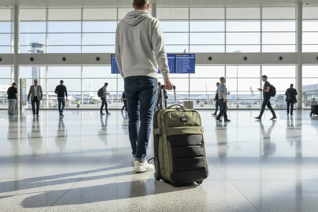 100% Poliéster reciclado Valija con ruedas 2 compartimientos principales sándwich 1 correas de compresión Asa de transporte y manija telescópica retráctil Ruedas de skate 2 bolsillos delanteros con cierre (uno se adapta para laptop) Base moldeada liviana Dimensiones: 51 x 34 x 24cm Peso: 2.25Kg Volumen: 41L Producto importado