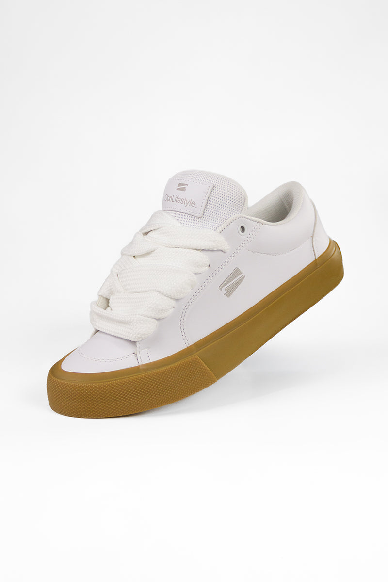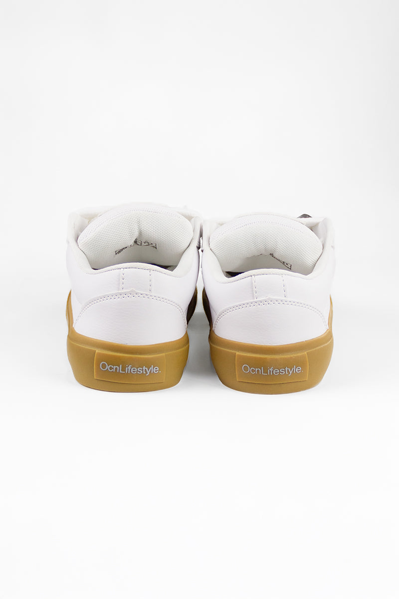 Zapatilla Ocn en color Blanco, combinación de lona gamuza y ante suela blanca, cordones en blanco.
